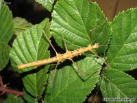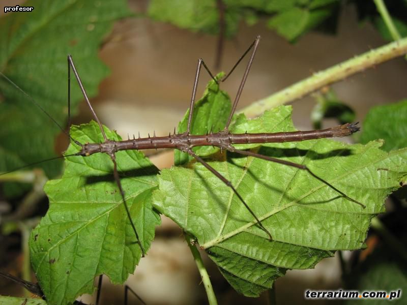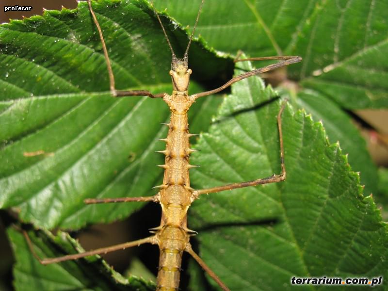 Samice dorastają do 6 cm są znacznie masywniejsze od samców, ich barwa może być różnorodna – brązowa, zielona, oliwkowa, itp. Często u samic przez środek ciała ciągnie się biały pas, wtedy kolce bezpośrednio przy pasie przybierają pomarańczowo-czarne barwy. Całe ciało najeżone jest licznie niewielkimi ostrymi chitynowymi wyrostkami. Czułki są długie, długości ok. 4-5 cm. Jako imago żyją średnio 10 miesięcy.