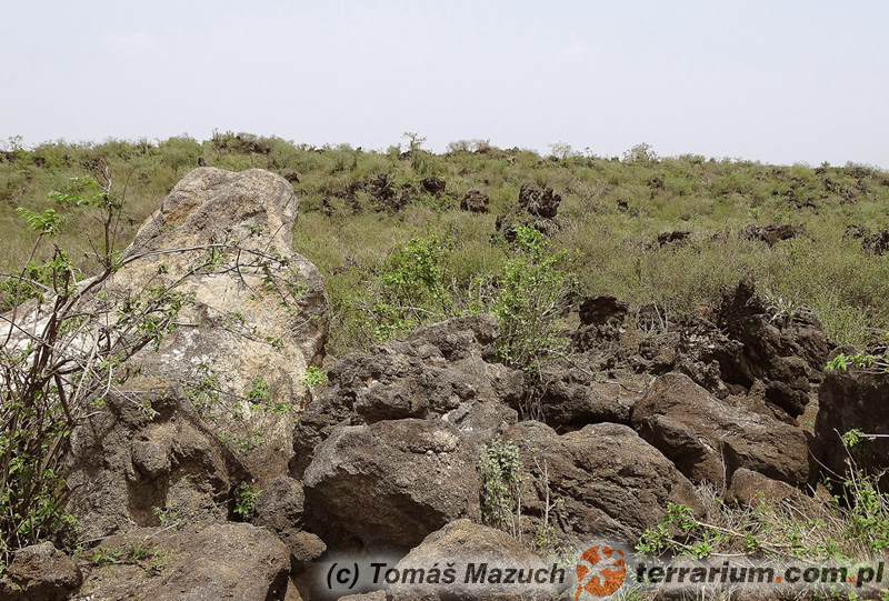 Terrarium pustynne. Jest to gatunek ściśle związany ze środowiskami skalistymi, dlatego terrarium musi mieć zbliżony charakter. Na podłoże najlepiej wykorzystać fragmenty darni wraz z elementami roślinnymi, takimi jak stare źdźbła i korzenie traw zmieszane ze żwirem o różnej granulacji. Na nim koniecznie należy wyłożyć dużą ilość różnej wielkości kamieni, poukładanych w taki sposób aby tworzyły zarówno pionowe jak i poziome powierzchnie. Koniecznie trzeba zapewnić odpowiednią ilość kryjówek, zwłaszcza, jeżeli trzymamy kilka samic. W centralnym punkcie terrarium należy umieścić kamień większy i wyższy od pozostałych, który będzie stanowił grzędę dla dominującej pary. warto także zainstalować ściankę strukturalną imitującą skały, dzięki czemu zwiększymy powierzchnię aktywności gadów. W terrarium można wstawić żywe rośliny tropikalne, takie jak sukulenty czy kserofilne trawy. Koniecznie należy unikać roślin toksycznych i posiadających kolce lub ciernie.