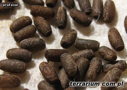 Koloru ciemnego z jaśniejszym, wąskim paskiem przechodzącym przez całą długość jaja. Są w kształcie beczki o długości ok. 3-4 mm, składane w podłożu.