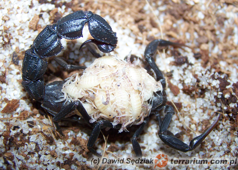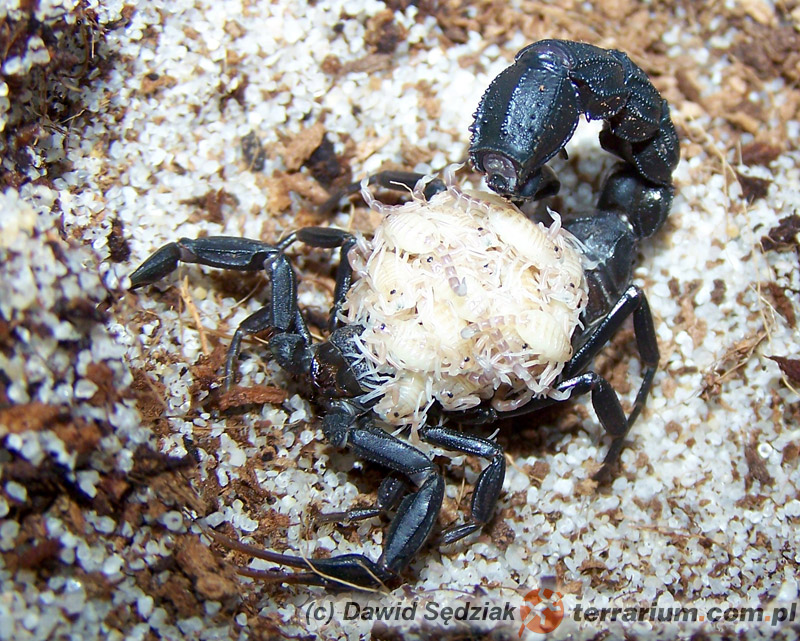 Jeśli posiadamy dojrzałą parę skorpionów, rozmnażanie nie stanowi większych problemów. Jeśli trzymamy skorpiony oddzielnie, to po połączeniu ich w jednym terrarium natychmiast zaczynają swój “taniec”. Aby samiec mógł złożyć swój spermatofor w zbiorniku nie może zabraknąć płaskiej powierzchni, może to być płaski kamień lub kawałek kory. Przy utrzymaniu dobrych warunków ciąża trwa od 4 do 6 miesięcy. Liczba młodych w miocie może wynosić około 30-40 młodych, młode skorpiony po zejściu z samicy mierzą około 10-12 mm. Aby uniknąć kanibalizmu, młode skorpiony należy rozdzielić do osobnych pojemniczków.