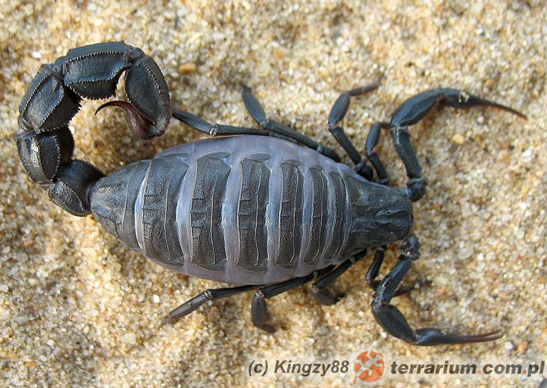 Wilgotność nie może być wysoka, gdyż skorpiony te są na to bardzo wrażliwe. Odpowiednia wilgotność powinna wahać się w granicach 30-40%. Dorosłym osobnikom nie trzeba spryskiwać terrarium, niezbędną wodę pobierają z pokarmu. Młodym osobnikom niedługo przed wylinką powinno się zrosić terrarium, aby mogły łatwiej ją przejść. Z wodą jednak nie należy przesadzić, skorpiony te są wrażliwe na grzybice, której (dzięki temu, że są czarne) nie jest tak łatwo widoczna jak u innych, jasno ubarwionych skorpionów.