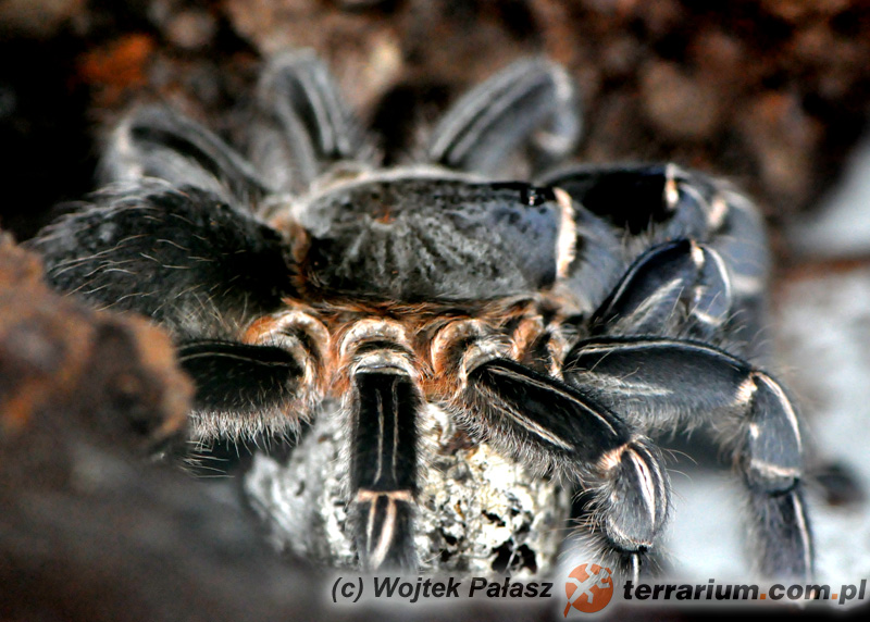 Liczba młodych w kokonie bywa różna, rozmnożyłem tego pająka już 3 razy, pierwsze rozmnożenie miało miejsce w styczniu 2005 – w kokonie były 284 sztuki – dwukrotnie udało mi się rozmnożyć go w lutym 2013 (byłoby trzykrotnie jednak jedna samica zjadła kokon) w pierwszym kokonie było 512 sztuk, w drugim 320. Myślę, że z ilością mogą dobić do 800 czy nawet 1000 sztuk, aczkolwiek pewności nie mam, ponieważ moje rozmnożenia są jedynymi o jakich wiem.