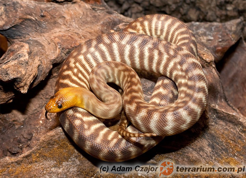 Coraz popularniejszy kopiący gatunek australijskiego pytona. Ciało dosyć krępe, masywne. Głowa żółta/pomarańczowa, lekko spłaszczona, prawie nie oddzielona od reszty ciała co pozwala mu kopać. Razem z większym kuzynem (A. melanocephalus ) nie posiada jamek termicznych jak inne pytony. Oczy czarne. Supraocular zabarwiony na czarno. Tło piaskowe/kremowe/złote przeplatane brązowymi pręgami. Z reguły osiąga 1,2-1,8m. Dożywa nawet 20-30 lat. Aktywność nocna. Jako że jest dusicielem nie jest jadowity.
