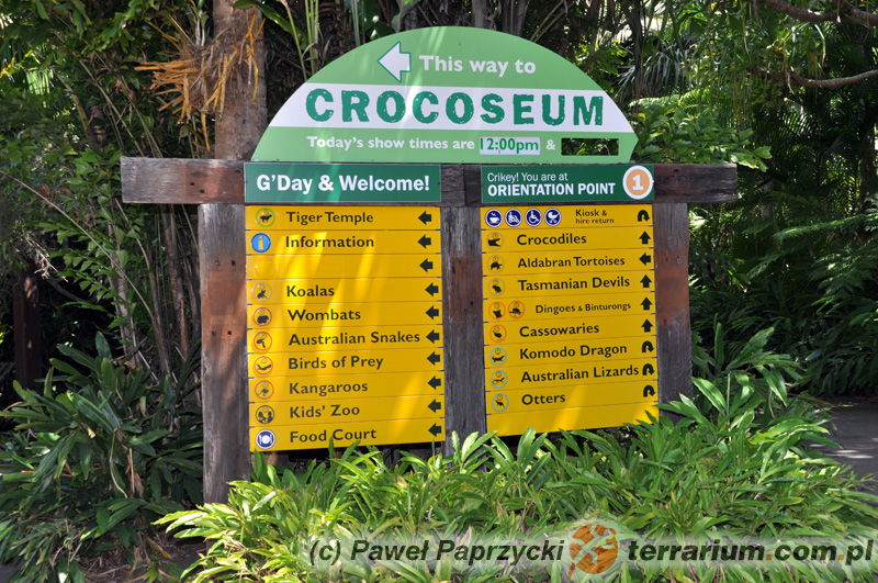 W pobliżu wejścia zobaczymy wiele wybiegów z krokodylami, żółwie olbrzymie (Aldabrachelys gigantea), żółwie wężoszyje Chelodina expansa oraz m.in. diabły tasmańskie (zacieniony pawilon, do podglądania życia nocnego diabłów) [mapa punkt 19], wybieg dla dingo [mapa punkt 22], pawilon z koalami (były bardzo blisko, wiele samic z uroczymi młodymi koala) [mapa punkt 24]. Kierując się natomiast główna drogą trafimy do Crocoseum [mapa punkt 29], czyli stadionu z basenem wodnym na 5,000 miejsc. Codziennie w samo południe odbywają się pokazy z udziałem różnej maści ptactwa (m.in. papugi, kondory) oraz krokodyli. Znajduje się tutaj również restauracja, punkt informacyjny, sklep z pamiątkami, plan fotograficzny dla chętnych na zdjęcia z koala za opłatą, a także tablica pamiątkowa ze zdjęciami archiwalnymi Irwinów, a także materiałami z gazet.