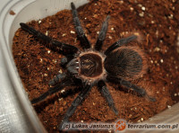 5. Dobra, mam ten gatunek od roku i oto co mogę o nim powiedzieć. Podkreślę że jestem początkującym terrarystą pajuniarzem i to był mój pierwszy ptasznik. I tak: w rok z L4 do L9 czyli dalej nie jest zbyt duży (taki większy kątniczek obecnie bym rzekł) ale już można powiedzieć o nim że jest piękny. Wiem już o co chodziło ludziom którzy mówili mi, że „pająk kamień”, „dla cierpliwych” i „może się szybko znudzić” – rzeczywiście bardzo wolno rośnie i rzeczywiście siądzie w jednym miejscu i totalnie nic nie robi, czasami nawet na dotyk pęsetą niechętnie reaguje. Ale przynajmniej siądzie w takim miejscu gdzie go widać zamiast się kryć czy zakopywać w dziurze, to jest plus. Nie mniej jednak jak dla mnie pająk piękny, najbardziej mi się podoba ze wszystkich, w zasadzie zawsze właśnie o takim marzyłem. O dziwo czasami potrafi się postawić, więc jeśli ktoś nie widział nigdy agresywnej braszki – to zapraszam do mnie ;)
