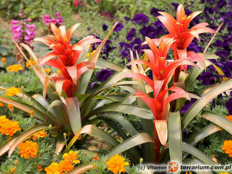 Opis: To grupa roślin jednoliściennych z rodziny ananasowatych pochodzących z lasów tropikalnych Ameryki Południowej i Ameryki Środkowej. Należą do niech m. in.: echmee, guzmanie, neoregelie i frizee. Większość bromeliowatych to epifity rosnące w konarach drzew. Charakterystyczne dla tej grupy są ich liście ułożone w rozetkę, co pozwala im gromadzić wodę z deszczu i mgły, a zebrane w środku organiczne resztki odżywiają roślinę. Z centralnej części rośliny wyrasta piękny (zwykle szkarłatny) „kłos” stanowiący kwiatostan. Bromelie świetnie nadają się do uprawy w wiwariach.