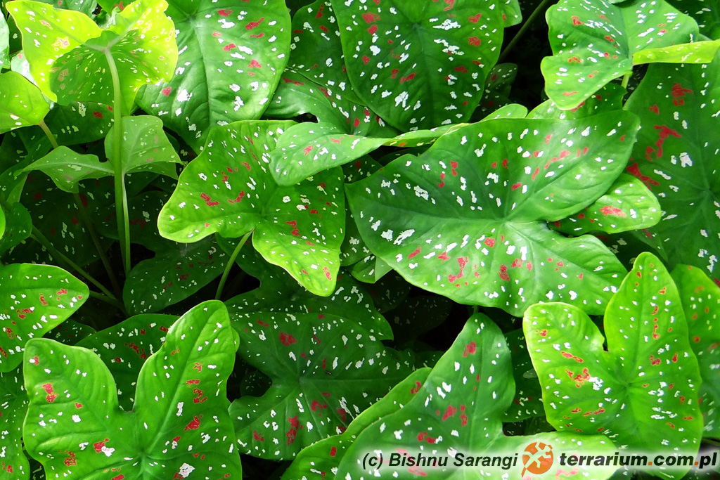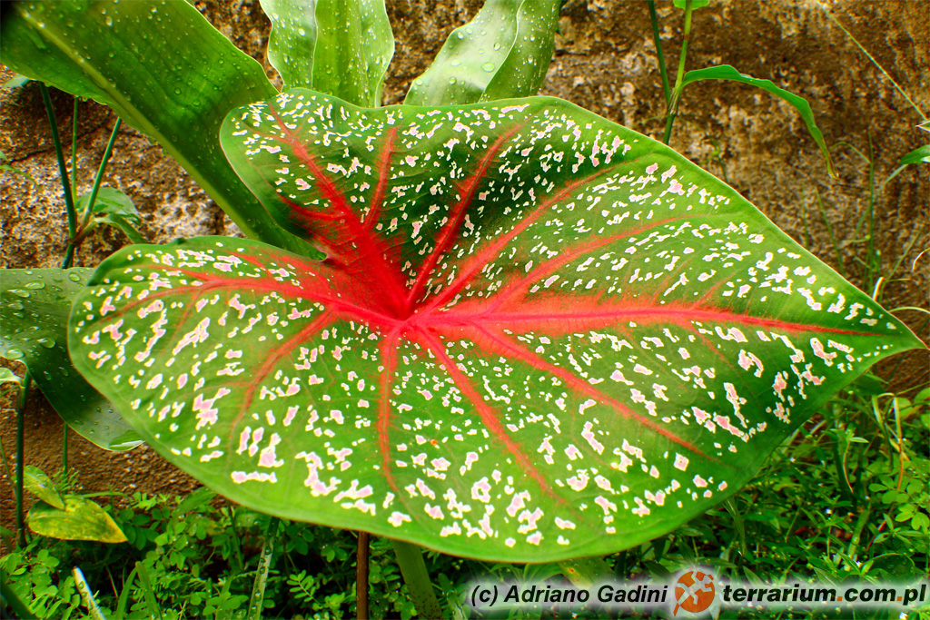 Informacje dodatkowe: Roślina ta jest bardzo wrażliwa, wymaga wysokiej temperatury i wilgotności powietrza, takie warunki można spełnić tyko mając palmiarnię albo właśnie terrarium, w warunkach pokojowych szybko by padła, a trzymana w terrarium będzie ozdobą przez wiele lat. Jedyny warunek udanej hodowli to okres spoczynku przypadający na zimę. Dlatego lepiej jest trzymać kaladium w niewielkiej doniczce którą łatwo jest ukryć.