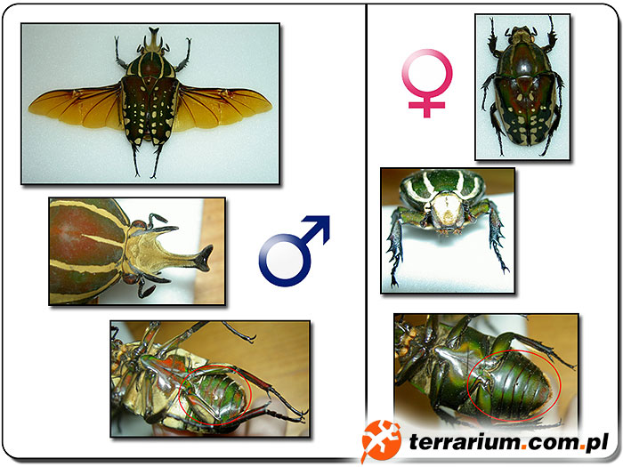 Rozpoznanie płci u tego chrząszcza jest możliwe zarówno w stadium larwalnym jak i imaginalnym. Stadium larwalne. Rozpoznawanie płci w tym stadium jest możliwe dopiero przy wielkości L3. Całą sztuka polega na odszukaniu małej czarnej kropki (herold organ) na końcowym segmencie larwy. Jeżeli znaleźliśmy takową kropkę, możemy być przekonani w 100% że jest to samiec.