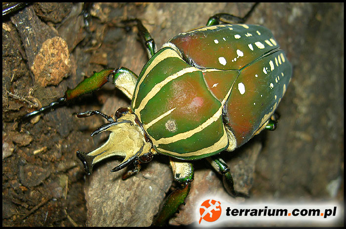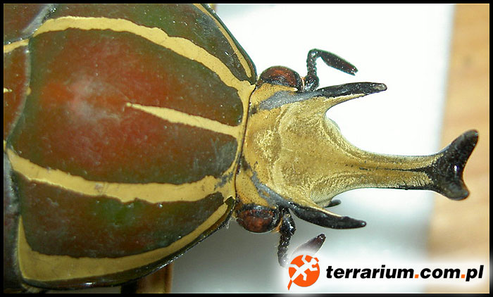 - Nad podłożem. W tej części terrarium, chrząszcze najczęściej chodzą, latają, jedzą i kopulują. Na powierzchnie podłoża kładziemy parę kawałków kory po to by zapobiegać wysuszeniu podłoża. Po za korą wyposażamy tą część w gałęzie (muszą być grube gdyż chrząszcze nie są małe) po to by zwiększyć powierzchnie do chodzenia. Wymagają oświetlenia przez 12 godzin dziennie. Temperatura w tej części powinna mieścić się w przedziale od 25ºC do 30ºC. Z tym że przy niższych temperaturach chrząszcze spowalniają swój metabolizm i raczej przesiadują ciągle w ziemi niż wychodzą na powierzchnie. Znowu zbyt wysoka temperatura powoduje szybkie przesuszenie podłoża, co powoduje śmierć larw, jaj i również imago. Wilgotność powietrza powinna się wahać w przedziale 65-75%.