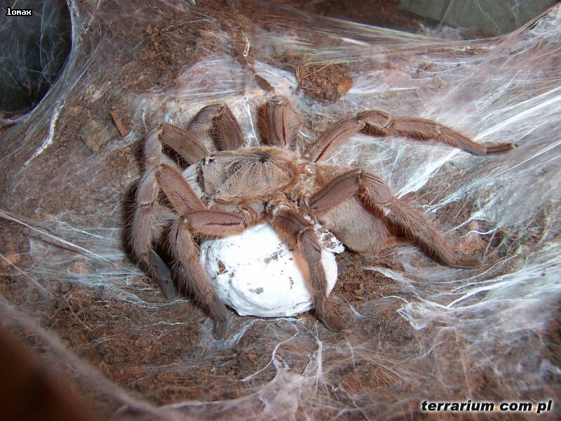 Samica dojrzewa około 11-12 wylinki (co oznacza 2-3 lata), samce po 1,5-2 latach. Czasami bywa agresywna w stosunku do partnera. Przed łączeniem należy parę obficie nakarmić, po czym wpuścić samca do terrarium samicy na 2-3 dni. Kokon inkubujemy w temperaturze 26-28°C. W kokonie bywa zwykle 150-250 żółto białych jajeczek, o wielkości 0,3 cm. Nimfy II pojawiają się w kokonie przeważnie po miesiącu inkubacji. W tym stadium są około 1,5 miesiąca, zanim zaczną przekształcać się w pełni ukształtowane pajączki.