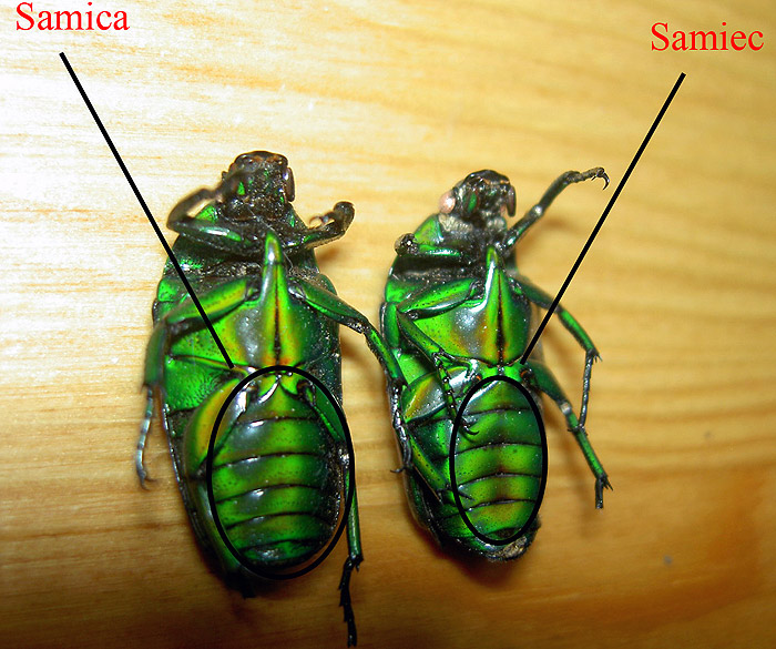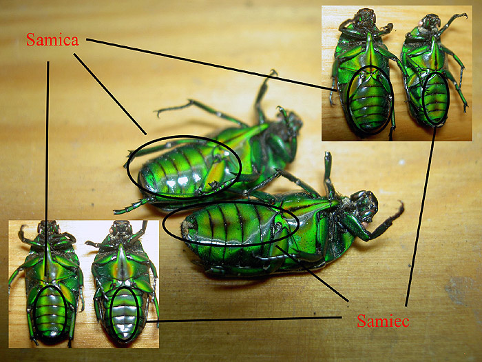 Mimo iż samce nie posiadają charakterystycznych rogów, rozpoznanie płci jest banalne. Samce posiadają długie wgłębienie po spodniej stronie odwłoka, samice jej nie mają i mają gładką spodnią stronę. Niestety ten gatunek ma zbyt małe rozmiary by rozpoznawać płeć larw.