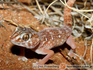 Najlepszym rozwiązaniem w przypadku tego gatunku jest całoroczny chów w parach lub haremie 1.2 z jednym tylko samcem w zbiorniku. Pozwoli to na wyeliminowanie nadmiernej agresji ze strony terytorialnego samca skierowanej nawet do nowo wprowadzanej do jego zbiornika samicy. Terrarium o wymiarach 60x40x30 cm (dł.x szer.x wys.)jest już odpowiednie dla pary czy tria tych gekonów.To urodzeni kopacze – z tego względu jest potrzeba zapewnienia grubej warstwy podłoża. Do tego celu możemy wykorzystać zarówno piasek z domieszką gliny, żwiru, włókna kokosowego lub torfu – co najmniej kilkucentymetrową warstwę substratu. Nieodzowne dla utrzymania dobrego samopoczucia i kondycji naszych gekonów jest zapewnienie kilku kryjówek – mogą to być kawałki tub dębu korkowego, połówki łupin orzecha kokosowego czy też szczeliny stworzone z odpowiednio ułożonych łupków piaskowca, odpowiednio zabezpieczonych przed osunięciem i ewentualnym przygnieceniem mieszkańców zbiornika. Uzupełnieniem dość monotonnego, pustynnego 'krajobrazu’ mogą być nieduże zasuszone gałęzie czy korzeń. Wszystkie elementy wystroju powinny być z łatwością wyjmowane w celu okresowego mycia czy dezynfekcji co z pewnością przyczyni się do zminimalizowania ryzyka rozwoju groźnych dla zdrowia gekonów bakterii chorobotwórczych.