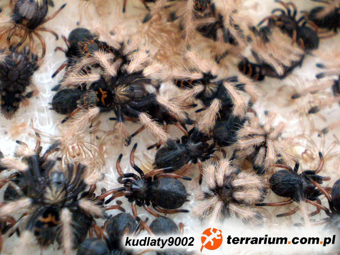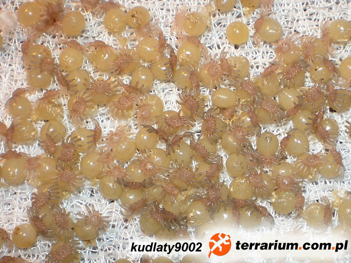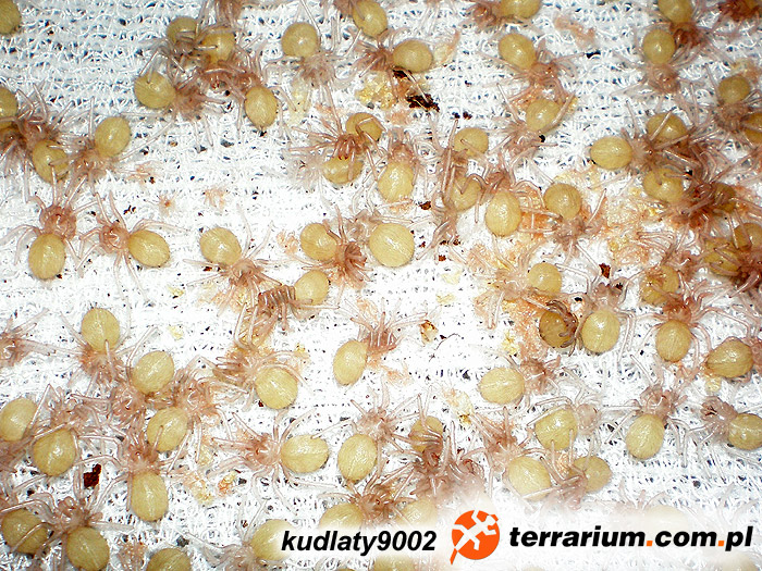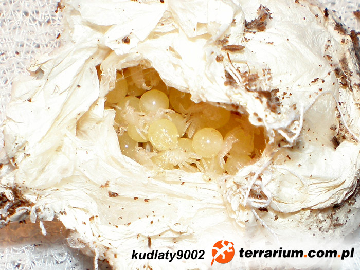 19.08.2010 – złożenie kokonu 28.08.2010 – odebranie kokonu , przełożenie do inkubatora 02.09.2010 – pierwsze otwarcie kokonu – w środku jajeczka, zaszycie kokonu 08.07.2009 – L9 07.10.2009 – L10 07.04.2010 – L11 19.06.2010 – pierwsza próba wpuszczenia samca do terrarium samicy, samica wykazywała zainteresowanie samcem. Pierwsza próba „podniesienia” samicy przez samca ok 01.00 w nocy, ok. 05.00 nad ranem po wielu nieudanych próbach samica wycofuje się. Przez około miesiąc ponawiałem próby dopuszczania co kilka dni jednak bezskutecznie, potem samiec zamieszkał z samicą na 2 dni, w tym czasie nie doglądałem tak często pajączków i nie widziałem momentu przekazania nasienia. Po tych 2 dniach zauważyłem brak zainteresowania sobą u pająków, samica nie zwracała na samca uwagi więc je rozdzieliłem. 19.08.2010 – samica składa kokon. Kilka dni wcześniej samica rozkopuje norkę w podłożu pod pniakiem (do której wcześniej w ogóle nie wchodziła) i zapajęczynowuje się w niej. 28.08.2010 – odebranie kokonu (ze względu na dziwne zachowanie samicy, która tego dnia opuściła norę i chodziła po terra z kokonem) i przełożenie do inkubatora własnej roboty. 06.09.2010 – NI 19.09.2010 – linieją na NII 21.09.2010 – wszystkie NII 22.10.2010 pierwsze L1 Temperatura w inkubatorze – ok 26°C, wilgotność na poziomie 80% wszystkich jaj w kokonie – ok 200 sztuk, w tym kilkanaście spleśniałych i z kilkunastu nic nie wyszło, 169 szt. przeżyło. Terrarium samicy: 40x25x30 cm (dl.x szer.x wys.) |
