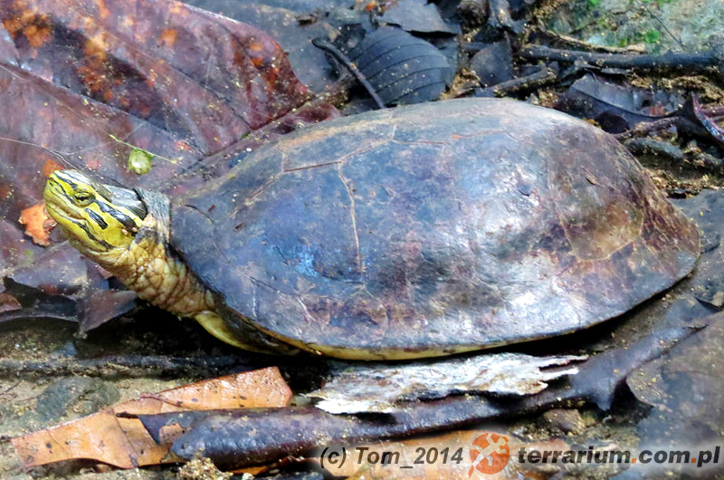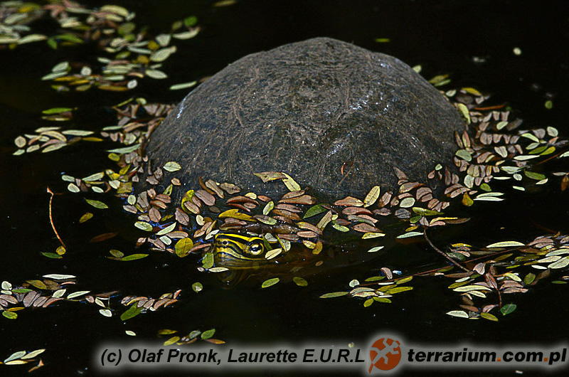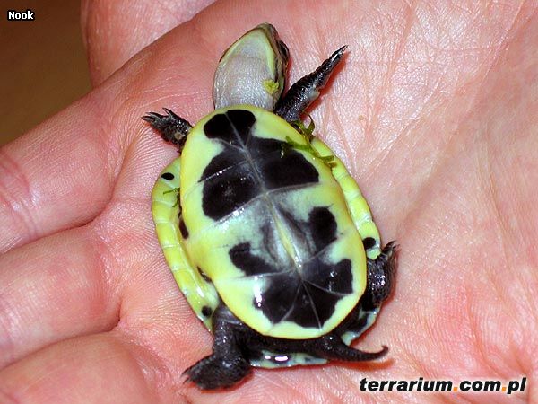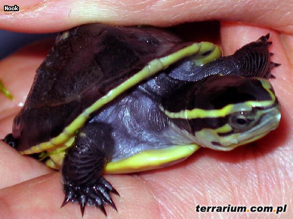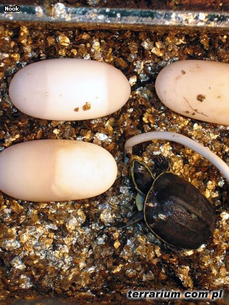 Pierwsze młode wystawiło łepek z jaja po 70 dniach inkubacji, drugie – nazajutrz. Wylęg trwał ok. 48 godzin. Nie chodziło jednak o to, że młode miały kłopot z wydostaniem się z jaja, tylko „oczekiwały” aż wchłoną wystającą ponad powierzchnię plastronu część pęcherzyka żółtkowego. Żółwie, którym pomaga się wyjść z jajka zazwyczaj mają jeszcze wystający woreczek żółtkowy. Po wylęgu obydwa żółwie mierzyły 4 cm. Z kolejnych dwóch jeden mierzył również 4 cm, drugi 3,6 cm, a z ostatniego jaja, choć było największe, młode mierzyło tylko 3,4 cm. Z inkubatora przenosiłem młode do plastikowej szuflady lodówkowej z wodą o głębokości ok. 3 cm i temp. 28°C. Kiedy już wchłonęły pęcherzyk (czyli po ok. 4-7 dniach), trafiały do akwarium (30 x 80 cm) z głębszą wodą (do 12 cm) przechodzącą płynnie w część lądową. Temperatura wody i powietrza wynosi tam 24-28°C. Młode z pozostałych 3 jaj wykluwały się również po ok. 70 dniach inkubacji – plus minus jeden dzień. Zdumiewająca punktualność!