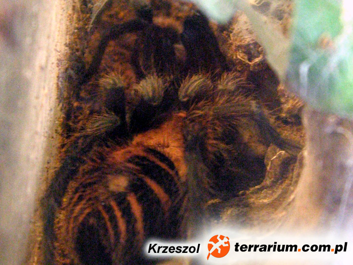 | Opis kopulacji: | 2008-06-14 – Kopulacja nastąpiła już po 3 tygodniach od wylinki samicy. Samiec wszedł do gniazda samicy, po wykonaniu zadania szybko uciekł na zewnątrz. Nie doszło do kolejnych kopulacji. | |