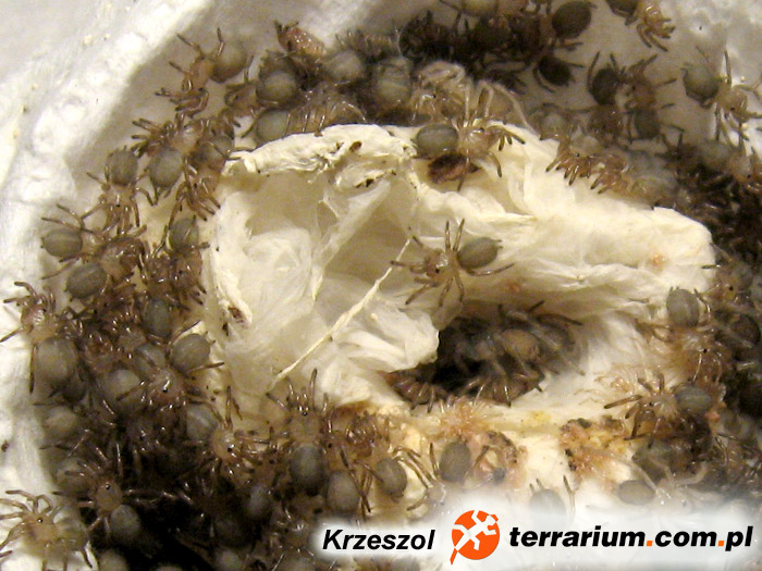 | Czas rozwoju nimf: | Po otworzeniu kokonu były w nim nimfy 2, czas rozwoju nimf trwał 3 tygodnie. Pająki po pierwszej wylince są naprawdę malutkie. Po tygodniu rozdzieliłem je do kliszówek. | |