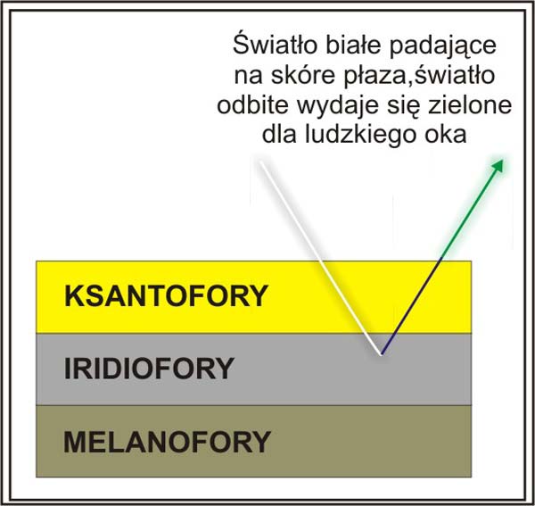 W skórze żab występują trzy typy komórek pigmentowych, tworzących trzy warstwy. Poszczególne komórki ułożone są w następującej kolejności (od najniżej do najwyżej położonych): melanofory, guanofory (irydofory), ksantofory. Melanofory zawierają melaninę, która nadaje płazom ciemno brązowe lub czarne zabarwienie skóry. Komórki irydoforów zawierają kryształki guaniny, które odbijają światło białe przenikające do skóry, jak małe lusterka. Z kolei ksantofory zawierają żółte pigmenty. Kiedy światło białe zostaje odbite od kryształków guaniny zmienia barwę na niebieską, następnie przechodzi przez żółte pigmenty (działają jak filtr) i powstaje kolor zielony (Rys.1.). Jak wiemy zmieszanie farby niebieskiej z żółtą daje kolor zielony. Barwa zielona może mieć różne nasycenie.