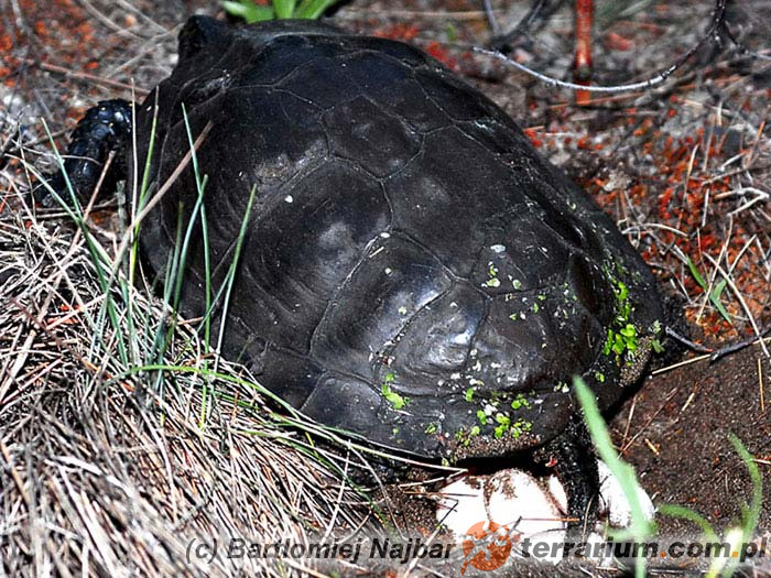 Samica żółwia błotnego (Nr 8; tzw. Anomalia,  z doliny Ilanki) składająca jaja.   –  Emys orbicularis – żółw błotny