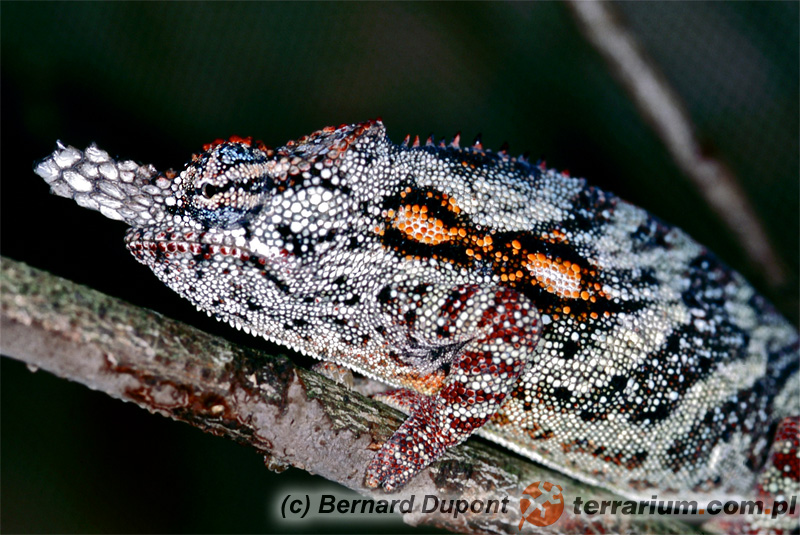 Jak zostało wspomniane wcześniej jest to jeden z niewielu gatunków kameleonów przy którym samce są ubarwione mniej kolorowo od samic. Podstawowe kolory samców to różne odcienie brązu z miejscowymi czarnymi, białymi i czerwono-pomarańczowymi przebarwieniami. Podniecony samiec wyraźnie ciemnieje, pojawiają się czarne pasy po bokach ciała a kończyny i ogon dostają czerwono-pomarańczowych przebarwień.