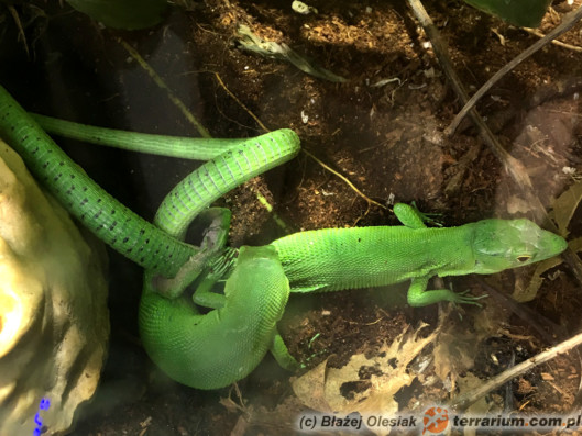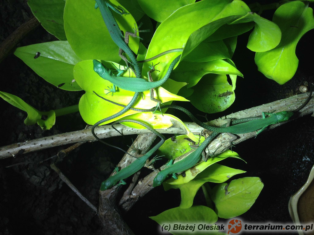 Odpowiednią wilgotność utrzymujemy poprzez zraszanie terrarium, najlepiej dwukrotnie w ciągu dnia, szczególnie po zgaszeniu lamp. Z własnego doświadczenia mogę powiedzieć, że najbardziej służy im wilgotność na poziomie 60-80%. Należy pamiętać, aby nie spryskiwać bezpośrednio jaszczurek, ponieważ powoduje to u nich niepotrzebny stres.