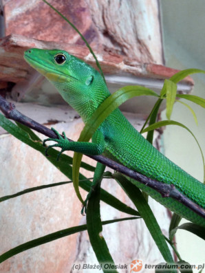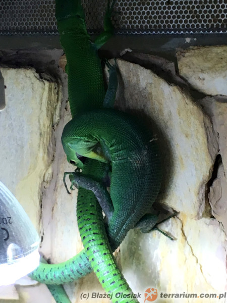 Jako że jest to gatunek nadrzewny, ważne jest odpowiednie stanowisko do naświetlania w górnej partii terrarium. Należy pamiętać o dobrym oświetleniu i źródle UV. Świetnie spełniają się w tej roli metalohalogeny, z własnego doświadczenia mogę również polecić te lampy do odchowu młodych.