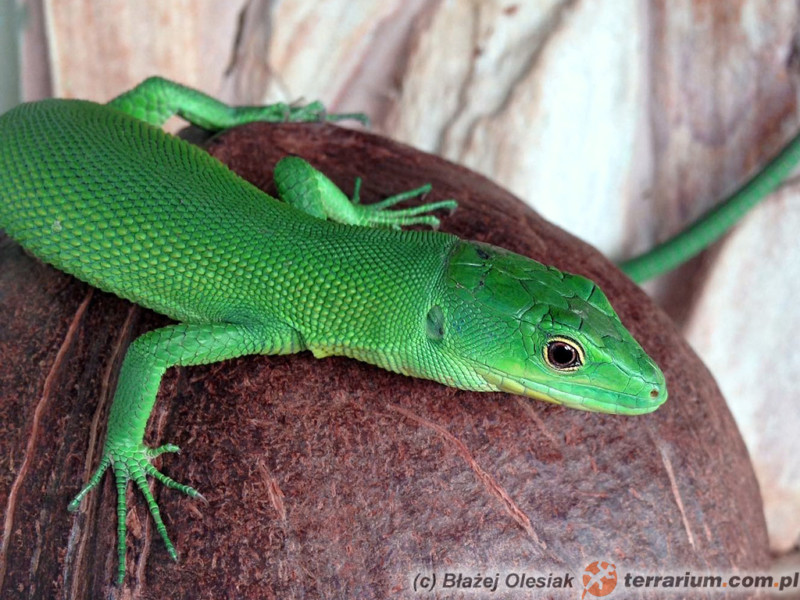 Gastropholis prasina jest pięknym, szmaragdowo-zielonym przedstawicielem rodziny Lacertidae. Jego grzbiet szmaragdowo-zielony, przechodzi w zielono-żółtą część brzuszną, a w okolicach łączeń z kończynami mogą występować turkusowe plamy. Tułów w zależności od osobnika może być z czarno nakrapianymi liniami po bokach, podobnie ogon może być czarno nakrapiany. Powyższe czarne kropki pojawiają się z wiekiem i nie u wszystkich osobników.
