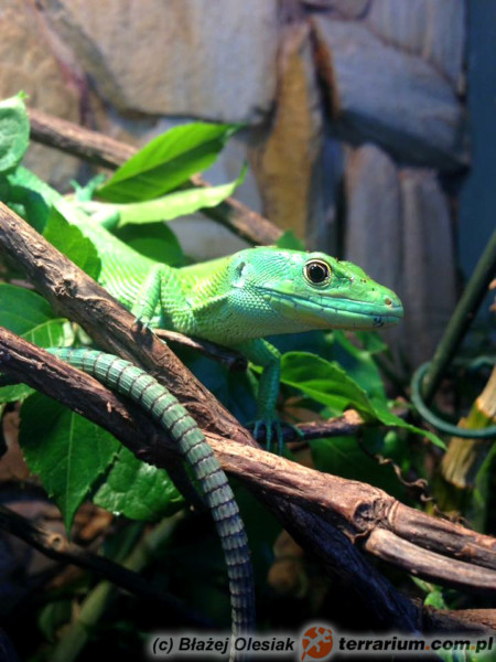 Jest to niedużej wielkości jaszczurka ta osiągająca długość 40-51 cm, przy czym około dwóch trzecich długości stanowi ogon. Głowa tego gatunku jest duża, długa i wąska, przechodząca w gruby kark, skutkiem czego nie widać wyraźnego przejścia między głową a tułowiem. Oczy duże z niewielką złotą tęczówką, język mocno czerwony. Tułów szczupły, ale przy tym dość masywny. Grzbietowa część tułowia zbudowana jest z niewielkich, gładkich i nie nachodzących na siebie łusek (w 28-40 rzędach), zaś brzuszna z masywnych, zwróconych na zewnątrz łusek z kilem (w 8-12 rzędach). Kończyny są dobrze rozwinięte, długie i mocne, wyposażone w pięć wydłużonych palców i ostre pazury. Kończyny tylne nieco grubsze. Ogon mocno wydłużony, chwytny, pełni ważną funkcję przy poruszaniu się wśród gałęzi i ma typową dla większości jaszczurek zdolność do autotomii. Utracony ogon odrasta.