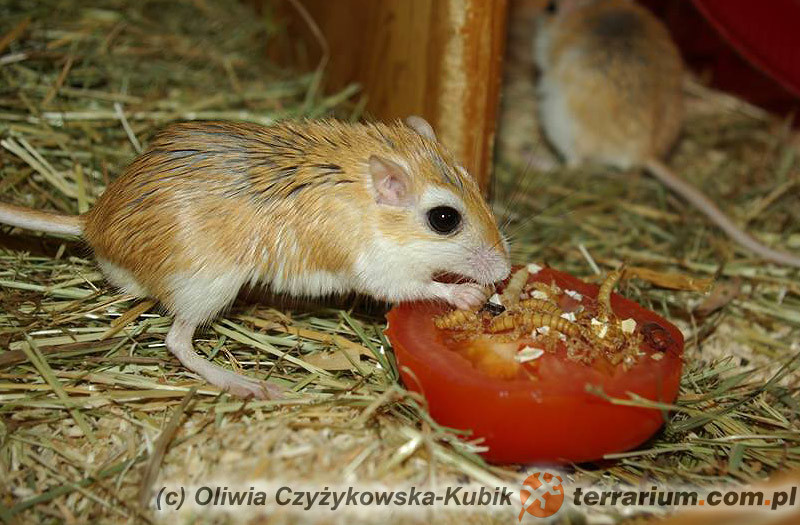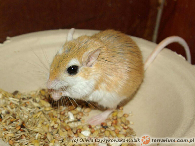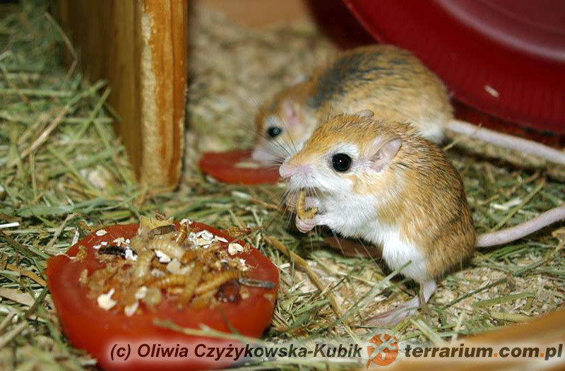 Najważniejsze przy urządzaniu terrarium jest dobór podłoża. Należy pamiętać że myszoskocze po przebudzeniu większość czasu spędzają na kopaniu, budowaniu tuneli i kąpielach piaskowych. Dlatego najlepiej jest podzielić zbiornik na dwie strefy: część „rodzinną „ z miękkim podłożem do budowania gniazda oraz część „roboczą” z miałkim piaskiem lub piaskiem pomieszanym z gliną. Część rodzinna powinna być wyłożona ściółką typu TierWol lub Chambiose – czyli podłoże konopne. To ostatnie sprawdza się bardzo dobrze, idealnie chłonie zapachy i wilgoć , nie pyli, i jest dostatecznie miękkie. Ważną cechą tej ściółki jest jej naturalny wygląd – dzięki czemu łatwiej można odwzorować naturalne warunki terenu piaszczysto-trawiastego. W części rodzinnej nie może zabraknąć również bardzo dobrej jakości siana – które jest używane przez myszoskocze do budowy legowisk. Część robocza powinna być oddzielona od części rodzinnej, aby podłoża się za sobą zbytnio nie mieszały. Można przedzielić zbiornik np. drewnianą listewką. W naszej hodowli stosujemy tzw. piasek szynszylowy. Natomiast osoby które używają podłoża z piasku i gliny, powinny zapewnić myszoskoczom pojemnik kąpielowy z czystym piaskiem bez dodatków.
