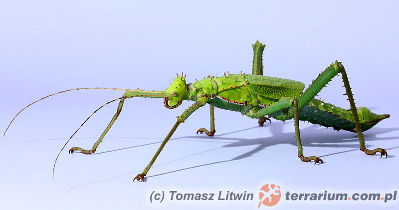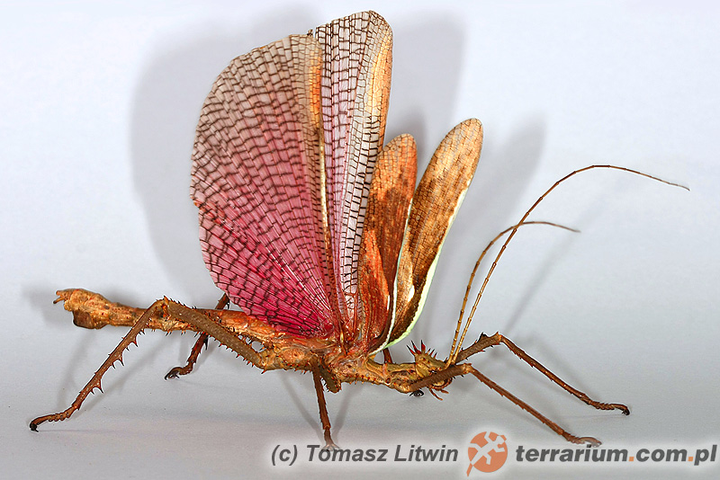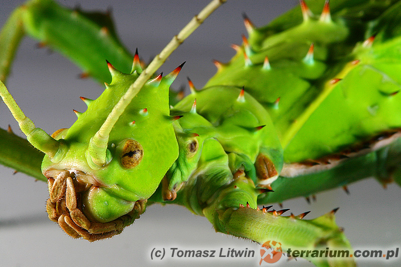 Niewątpliwe urzekają swoją barwą, a zarazem wielkością. Zaniepokojone potrafią wydawać szeleszczące dźwięki pocierając pokrywami skrzydeł, a także boleśnie ścisnąć kolczastymi odnóżami. Jest to bardzo ciężki straszyk, samice mogą ważyć nawet 70g! U tego gatunku dość często występuje gynadomorfizm. Jest to jeden z rarytasów w hodowlach. Owad ten jest bardzo specyficzny, posiada bardzo charakterstyczny wygląd, który powala hodowców na kolana. Przy okazji jest dość trudny w hodowli, co czyni go mimo wszystko bardzo pożądanym gatunkiem. Obie płci tego gatunku są bardzo zróżnicowane pod względem morfologicznym, samice są wielkie i zielone, natomiast samce smuklejsze, brązowe, wyposażone w skrzydła.