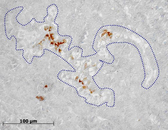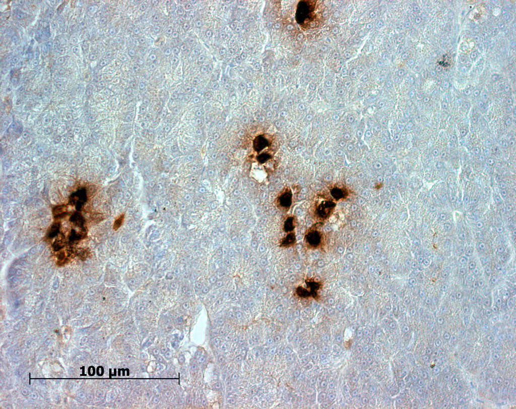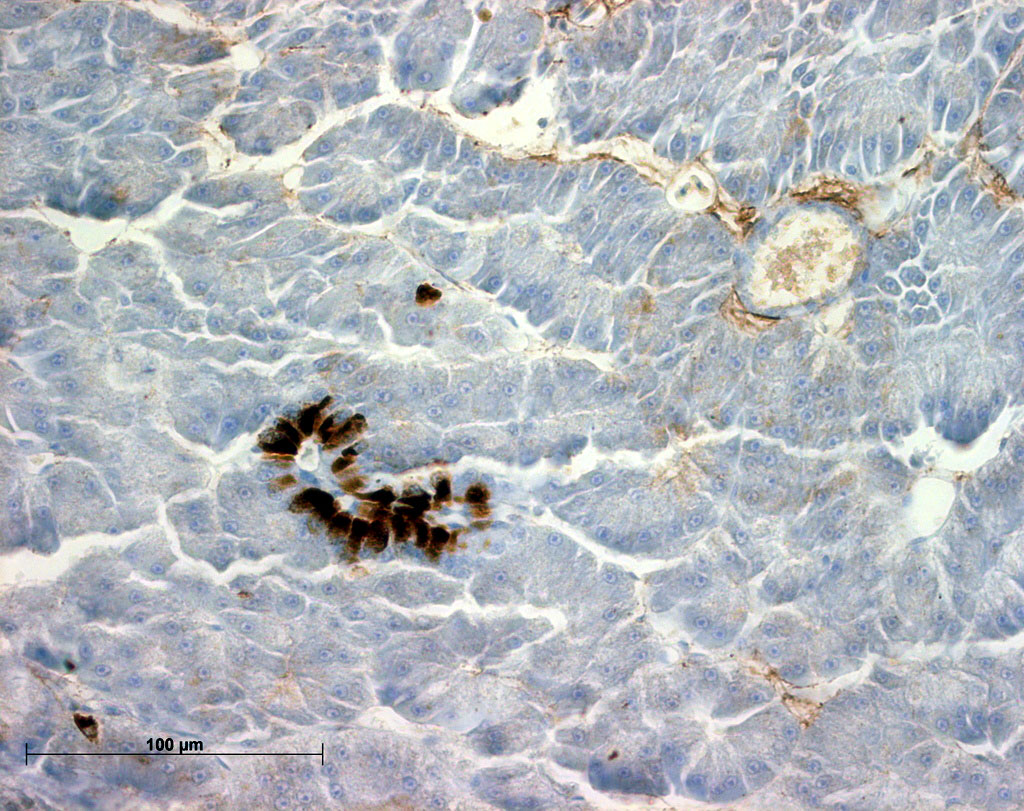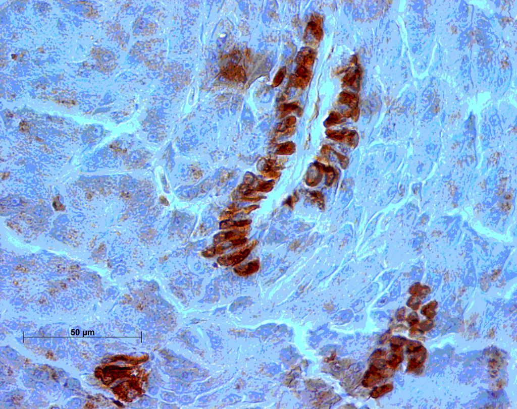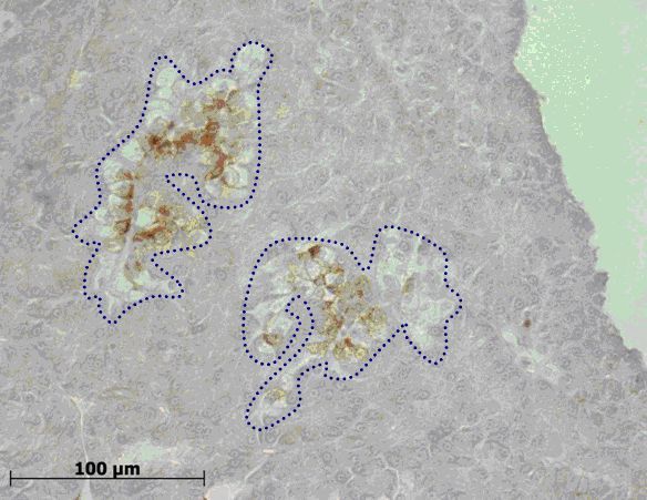 Wyspy trzustkowe jaszczurek właściwych mają bardzo nieregularny (fot. 7-8 – wyspy trzustkowe obrysowano niebieską przerywaną linią) kształt prawdopodobnie charakterystyczny dla gatunku. Struktury te wydzielają grelinę (fot. 9), obestatynę (fot. 10), somatostatynę (fot. 11), insulinę (fot. 12), glukagon (fot. 13) oraz polipeptyd trzustkowy (fot 14).