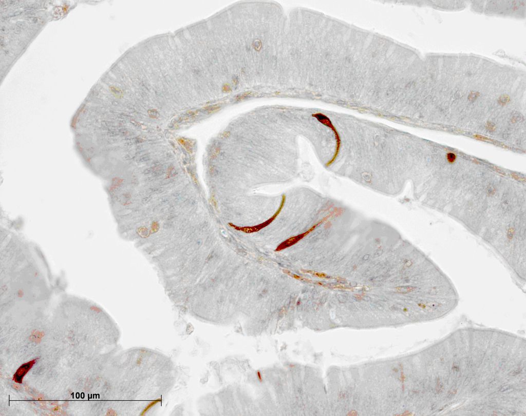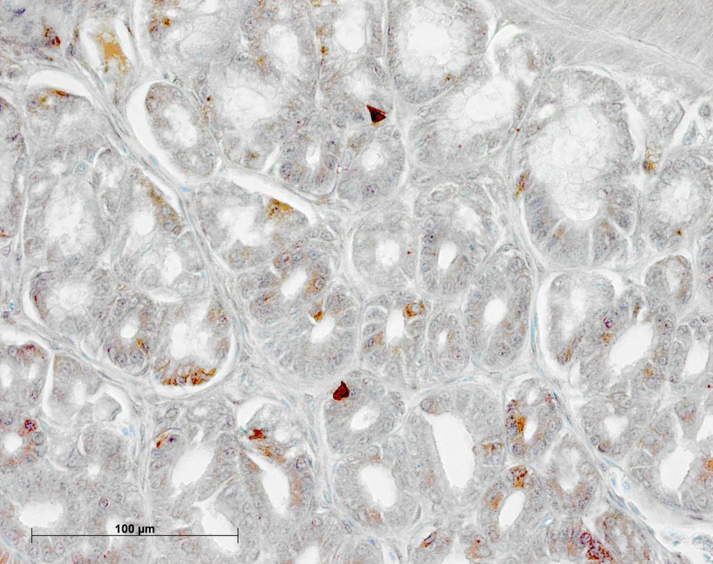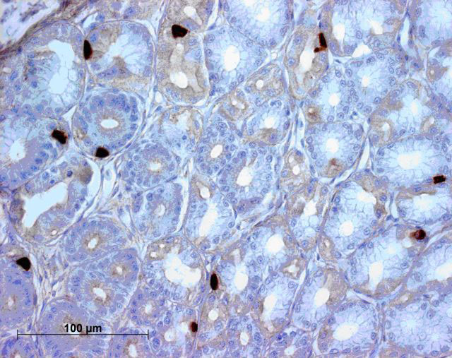 Dotychczas stwierdzono występowanie komórek wydzielających grelinę (fot. 1), obestatynę (fot. 2) oraz somatostatynę (fot. 3) w żołądku jaszczurek właściwych. Komórki wydzielnicze w tkankach żołądka zlokalizowane były w odźwierniku (większość) i w dnie.