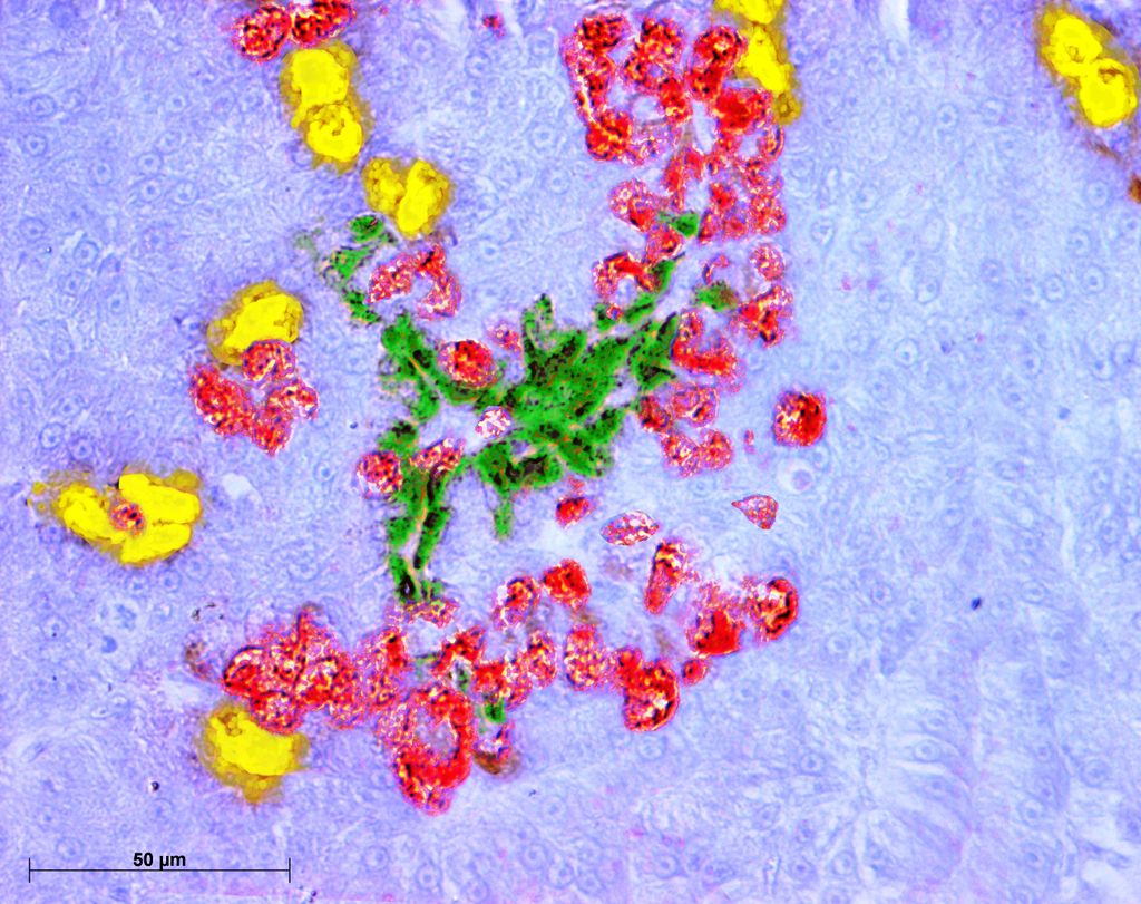 Aby ukazać wygląd struktury jaką jest wyspa trzustkowa jaszczurek wykonano preparat sekwencyjny (pochodzący z trzech kolejno po sobie następujących warstw tkanki). Obszar zajmowany przez wyspę trzustkową jaszczurki uwidoczniony został przy pomocy trzech hormonów: insuliny, glukagonu i somatostatyny. Na zdjęciach zmieniono kolory a następnie nałożono je na siebie. Dzięki temu na czerwono widoczny jest glukagon, na żółto somatostatyna, na zielono natomiast insulina (fot. 15).