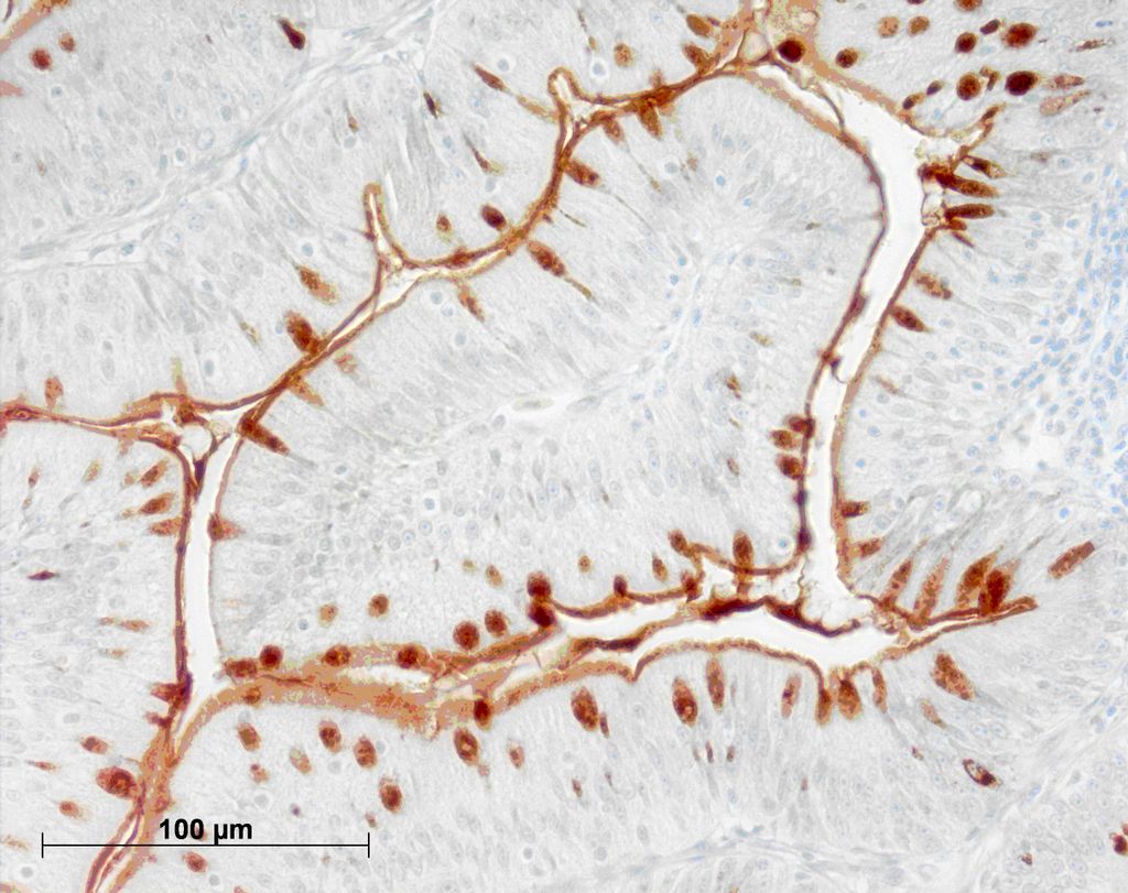 W jelicie cienkim zlokalizowano grelinę (fot. 4), obestatynę (fot. 5) oraz bardzo zróżnicowane komórki wydzielające somatostatynę (fot. 6).
