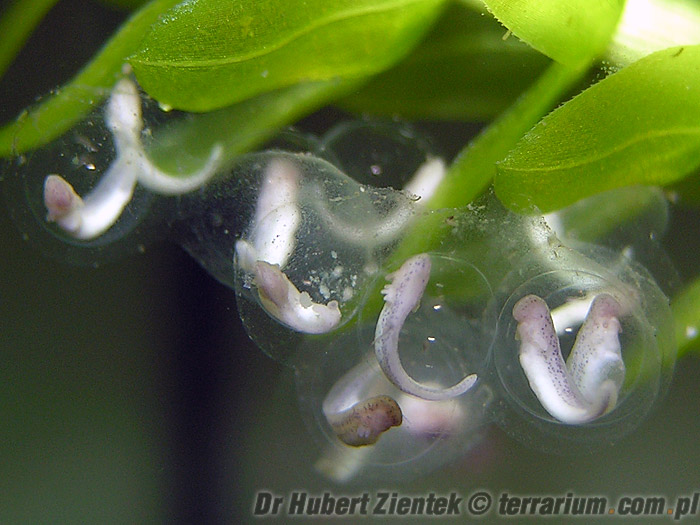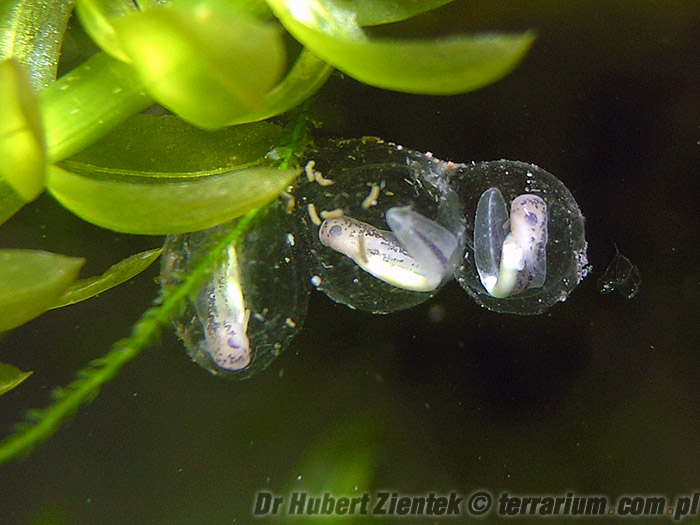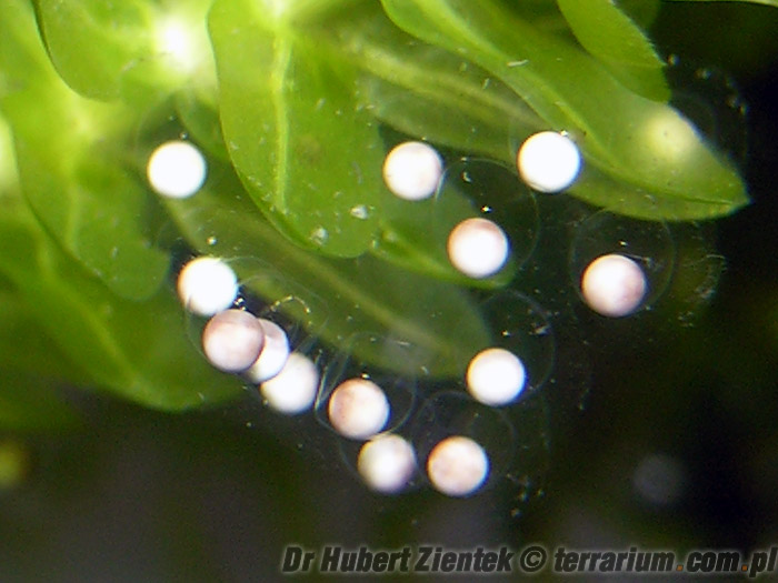 Po złożeniu jaj osobniki rodzicielskie odławiamy. W mojej hodowli nigdy nie pożerały one jaj, natomiast bywało, że zjadały larwy. Wodę intensywnie napowietrzamy. Jej temperatura powinna oscylować wokół 20°C. Wylęg larw następuje po 8-12 dniach. Mają one kolor szary do jasnobrązowego z upstrzeniami. Najczęściej leżą na dnie (starsze lubią osiadać na roślinach lub podwodnych elementach wystroju) i tam też żerują. Pierwszym ich pokarmem powinny być larwy solowca (koniecznie dobrze oddzielone od skorupek, inaczej może dojść do zatkania jelit), najdrobniejszy zooplankton (oczlik, rozwielitka) lub nicienie „Mikro”. Na 4-5 dzień można już podawać siekane i dobrze przepłukane rureczniki. Później jedzą już tarte mięso, ochotkę, szklarkę itp. Rosną bardzo szybko, a karmione zooplanktonem mają charakterystycznie na pomarańczowo zabarwione brzuchy – to najlepszy dowód na intensywne żerowanie.