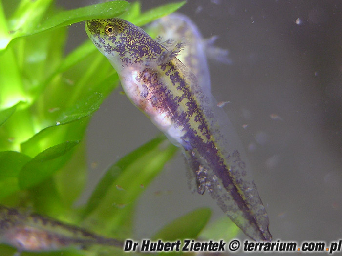 Mimo, że wśród larw nie występuje typowy kanibalizm, to jednak zalecam segregowanie ich według wzrostu i maksymalne rozgęszczanie obsady. W przeciwnym bowiem razie dochodzi do wzajemnego podgryzania sobie płetw ogonowych i cienkich palców, zwłaszcza w kończynach przednich. Co prawda, nie powoduje to utraty życia, ale okalecza je, utrudnia pływanie i żerowanie, stwarza niebezpieczeństwo zakażenia oraz wydłuża czas odchowu. Przeobrażenie, czyli metamorfoza zachodzi stopniowo, w przeciągu kilku miesięcy. Jako pierwsze, po kilku tygodniach pojawiają się kończyny przednie, a po następnych kilku także tylne. W miarę wzrostu zanikają pierzaste skrzela zewnętrzne na rzecz rozwijających się płuc, a skóra staje się bardziej szorstka. Po kilku miesiącach życia w wodzie w pełni ukształtowanym, młodym traszkom należy stopniowo obniżać poziom wody do 20-25 cm. Osobiście przenoszę je wtedy do obszernego akwaterrarium z mnóstwem roślin i częścią lądową. Wiele młodych osobników pozostaje cały czas w środowisku wodnym, a tylko nieliczne przebywają na wilgotnym lądzie. Wychodzenie z wody przybiera nieco na sile, gdy temperatura wody przekroczy 27°C oraz w przypadku, gdy traszki odchowywane są w dużym zagęszczeniu. Oprócz larw ochotek młodym osobnikom można podawać, larwy komarów, rureczniki, szklarki, wazonkowce (doniczkowce), najmniejsze larwy mącznika (Tenebrio monitor, zwanego potocznie „Buffalo”) oraz małe świerszcze (tzw. pinheady).