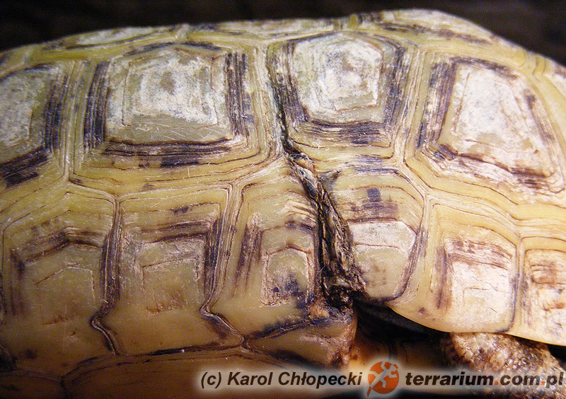 Aby móc dokładnie obejrzeć żółwia, jego głowę, oczy, mięśnie skroniowe, kończyny, i miękkie części ciała należy postępować ostrożnie i na pewno nie z użyciem siły. Oczy powinny być otwarte, błyszczące, lekko wilgotne, ale nie łzawiące(jest to często spotykane przy utrzymywaniu zbyt niskiej wilgotności) zapadnięte (zwierzę w złej kondycji, odwodnione i wychudzone) , zaczerwienione z opuchniętymi powiekami. Nozdrza powinny być suche, bez widocznej wydzieliny, która wraz ze świszczącym oddechem może być objawem poważnej choroby układu oddechowego. Skórę oglądamy w poszukiwaniu pasożytów zewnętrznych (kleszczy), otarć, zranień.