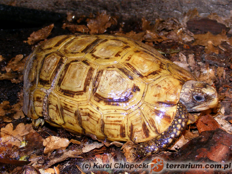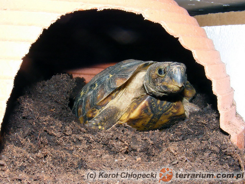 Do wystroju możemy użyć korzeni, kęp traw np. kostrzewy, kamieni, suchych liści. Konieczny jest płytki zbiornik na wodę o dużej powierzchni. Niektóre osobniki potrafią spędzić w nim znaczna cześć dnia. Są to żółwie, które każdego dnia wypijają duże ilości wody i jak większość gatunków bardzo lubią oddawać w czasie kąpieli kał i mocz, dlatego konieczne jest codzienne czyszczenie basenu. Z racji skrytego trybu życia i podatności na stres terrarium urządzamy tak, aby było dostępnych kilka kryjówek. W takim schronieniu ściółka powinna mieć wyższą wilgotność i być częściej wymieniana, ponieważ mają w zwyczaju zanieczyszczać ją odchodami. Bardzo ważne jest utrzymanie dość wysokiej wilgotności. Powinna ona oscylować w przedziale 50 – 80%. Osiągamy to dzięki codziennemu kilkukrotnemu zraszaniu terrarium. Jest to również czynnik stymulujący aktywność i apetyt u tego gatunku.