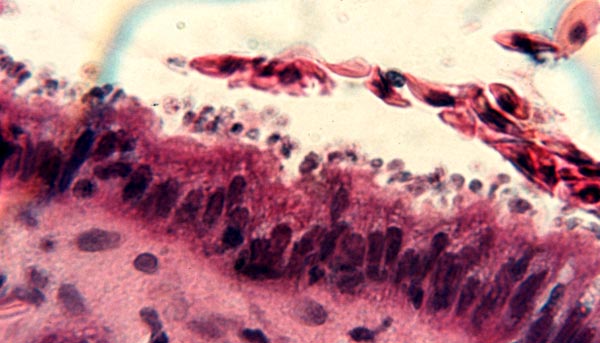 Rysunek 6. Błona śluzowa żołądka ze stadiami rozwojowymi Cryptosporidium sp. widoczne również erytrocyty. – Kryptosporidioza gadów