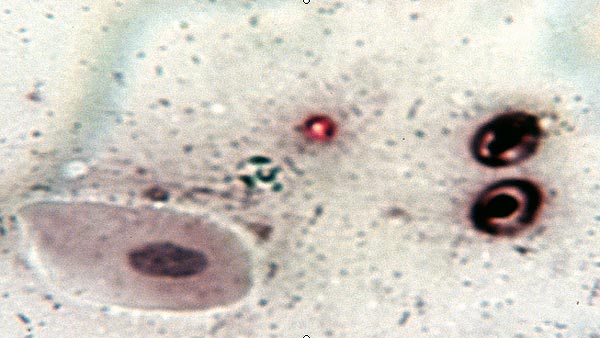 Rysunek 3. Rozmaz z wymiocin węża zainfekowanego Cryptosporidium sp. widoczne 3 erytrocyty oraz jedna oocysta.  – Kryptosporidioza gadów
