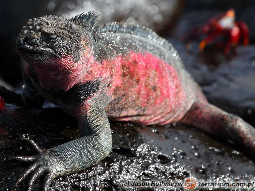 Wyspy Galapagos to świat legwanów morskich. Jaszczurki te doskonale opanowały sztukę pływania i nurkowania (nawet do 15 minut) by pożywić się wodorostami na podwodnych łąkach. Ze względu na zimne prądy opływające wyspy Galapagos legwany muszą odpowiednio dobrać czas nurkowania by nie ulec niebezpiecznemu wychłodzeniu. Po kąpieli wspinają się na skały i wygrzewają w promieniach słońca, przy tej okazji wydalają za pomocą gruczołów w nosie sól pochłoniętą wraz z pokarmem. Tryskają wtedy kryształkami soli na znaczną odległość.