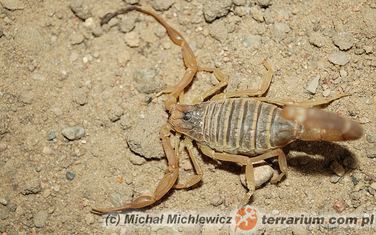 Dla dorosłej pary w zupełności wystarczy terrarium o wymiarach 30×30 cm. Dla skorpiona wysokość nie ma większego znaczenia, ponieważ nie potrafi on spinać się po gładkich powierzchniach, jednak dla naszego bezpieczeństwa im wyższe tym lepsze, dlatego że skorpiony te słyną z umiejętności podtrzymywania się na metasomie, co znacznie zwiększa ich zasięg (preferowane minimum 25 cm), zminimalizuje to ryzyko ukąszenia. Najlepiej sprawdzają się terraria otwierane od góry tzw. typu czeskiego, są one wygodniejsze przy manipulacji oraz bezpieczniejsze dla nas. Jako podłoże najlepiej użyć mieszanki różnych piasków. Piasek zawsze staramy się dopasować kolorystycznie do skorpiona, tak aby miał możliwość kamuflowania się. Należy również pamiętać, że skorpiony te podkopują się dlatego też warto pomyśleć o takiej mieszance piasków, która zbyt łatwo się nie przesypuje. Idealnym rozwiązaniem jest mieszanka piasków o różnych rozmiarach. Młode osobniki trzymamy w odpowiednio małych pojemnikach. Warto pomyśleć o kryjówce, w której za dnia będzie skorpion przebywał. Kryjówkę możemy stworzyć używając kamieni, należy jednak zwrócić uwagę na stabilność takiej konstrukcji, ponieważ podczas manipulacji istnieje ryzyko przypadkowego zsunięcia się owych kamieni i przygniecenia naszego skorpiona. Zatem warto ograniczyć budowanie różnych konstrukcji z niepewnych kamieni i zastąpić je jednym większym kamieniem o płaskiej strukturze, dzięki temu skorpion z łatwością będzie mógł się podkopać pod niego. Ponadto jako kryjówkę możemy użyć kawałków kory, korzenia, doniczek lub odpowiednie spreparowanego kokosu.