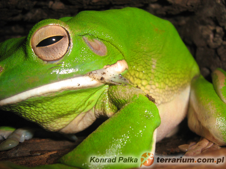 Litoria infrafrenata podczas wylinki. W lewym kąciku ust widoczny cienki, przezroczysty oskórek – Litoria infrafrenata – rzekotka nowogwinejska