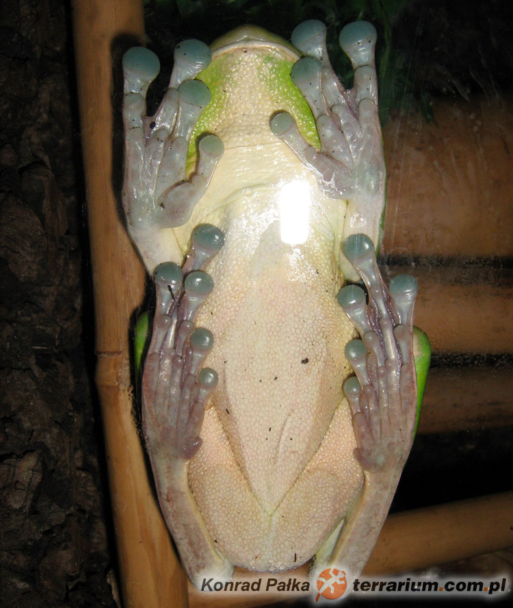 Litoria infrafrenata śpiąca na pionowej i gładkiej powierzchni, jaką jest przednia szyba terrarium.  – Litoria infrafrenata – rzekotka nowogwinejska