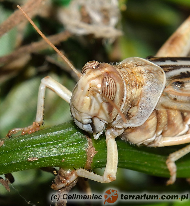 Minimum 25°C, optymalna 28-35°C (nawet do 45-50°C bezpośrednio pod żarówką), zapewnia pełny cykl rozwojowy do 6-7 tygodni. W niższej trwa on dłużej. Temperatury poniżej 20 stopni zaburzają rozwój szarańczy.