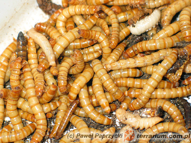 Jako podłoże i jednocześnie pokarm najlepiej sprawdzają się otręby pszenne. Ich warstwa powinna mierzyć 10-20 cm. Często, jako dodatek, stosowana jest mąka. Nie polecam jej jednak ze względu na możliwe zawilgocenie. W tym przypadku mąka ulega zamianie w kleistą papkę, potrafiącą uśmiercić całą hodowlę.
