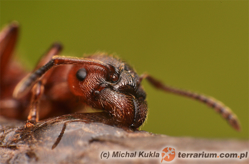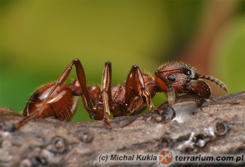Dodatkowo, biorąc pod uwagę obserwacje dokonane przez innych myrmekofili (gat.: ludzki ;) ) mogę stwierdzić, że mrówka ta jest terytorialistką (albo raczej gatunkiem dominującym w okolicy gniazdowania i dopuszcza, co prawda, sąsiedztwo oportunistycznych kolonii, jednak w razie braków białkowych korzysta z obcych robotnic jako z pokarmu, również w trakcie rójki potrafi oblegać pobliskie gniazda jakby „na zapas”, prawdopodobnie celem ochrony roju – przyp.red.) . Natomiast jej agresja wobec innych mrówek (w szczególności jej natężenie oraz sposób eliminacji) zależy od ilości pokarmu białkowego. Gdy jest go wiele – wynosi obce robotnice, gdy jest go mało – bez pardonu zabija; a trzeba Wam wiedzieć, że jad Manica jest bardzo silny – nawet królowa Camponotus ligniperdus po pojedynczym użądleniu zostaje sparaliżowana). W czasie walk międzyplemiennych Manica stosuje nieco zmodyfikowaną wersję pasywnego pressingu, stosowanego przez Myrmica sp. (polega on na tym, że mrówki otaczają otwór wejściowy atakowanego mrowiska i straszą usiłujące wydostać się mrówki). Mianowicie, Myrmica rzadko kiedy udaje się złapać ofiarę, natomiast Manica atakuje z powodzeniem, po czym ze złapaną mrówką pędzi do swojego gniazda. Można wnosić z tego zachowania, że jej ataki raczej nie mają na celu wytępienie obcych mrówek, lecz pozyskanie pokarmu białkowego. Jednak ilość danych jest niewystarczająca, by odpowiedzieć na to frapujące pytanie. W momencie zasiedlenia Formica rufibarbis będę miał większe pole do popisu.