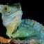 Basiliscus plumifrons ma zupełnie inne zwyczaje. Generalnie przebywa tuż nad wodą, chętnie do niej wchodzi. Na każde niebezpieczeństwo reaguje ucieczką do wody i pod kamień. Basilicus plumifrons przy zagrożeniu ma strategie „schować się” zaś Basilicus vittatus strategię „uciekać” wręcz unikając zakamarków, szuka wolnej przestrzeni. Basilicus plumifrons rośnie jakby szybciej. Jest jednak znacznie mniej bystry przy zdobywaniu pożywienia na lądzie od viatausków. Za to lepiej sobie radzi z łapaniem ryb. Polowanie na nie to oddzielna historia. Wszystkie chętnie obserwują je pływające w zbiorniku. Czasem vittatuski decydują się na nie zapolować robiąc to chaotycznie, bazując na swojej szybkości. Raczej bez rezultatów. Po prostu gonią rybki jak owady po lądzie, tyle ze wykonując kolejne zanurzenia. Plumifrons ma zupełnie inną strategie połowów. Nie atakuje „z marszu” a zbliża się płynnym spokojnym ruchem do konara tuz nad wodą jedynie głową wodząc za rybką. Zsuwając się lekko głową w dół w kierunku lustra wody. Atak jest błyskawiczny ,podobnie jak u vitauska, skacze w dół na głowę z lekko otwartym pyszczkiem. Rzadko udaje mu się jednak jakąś złapać. Nigdy nie wiem czy złapał, czy też nie, bo podgardle ma wypchane najprawdopodobniej wodą. Jednak regularnie liczba rybek mi się zmniejsza, więc ktoś je zjada. Stawiam na plumifornsa. Tym bardziej, ze podejmuje te próby regularnie. Rybki wyrzucone przeze mnie na mech są zjadane przez wszystkie bazyliszki bardzo chętnie. Rybki sprawdzają się dobrze jak gdzieś wyjeżdżam. Jest to awaryjne jedzenie. Jeśli nie dostaną świerszczy przez kilka dni (wyjazd na urlop) sięgają do tej rezerwy. Powiem tyle ze po powrocie z urlopu zjedzone było 9 rybek. Do czego przyczyniła się prawdopodobnie ponad 5-cio dniowa głodówka. Osobiście uważam, że bezpieczniejsze jest pozostawienie ich w terra na kilka dni bez jedzenia niż dawanie komuś na przechowanie.