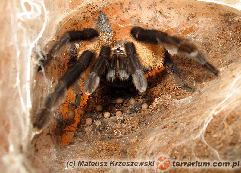 | Metoda odchowu: | kokon pozostawiony samicy do wyklucia młodych, młode pozostawione z matką na 2-3 wylinki | |