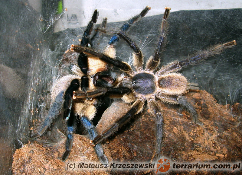 | Żywienie | Karmienie samicy przed łączeniem nie było zbyt intensywne ze względu na jej umiarkowany apetyt. Podawano jej dorosłe karaczany szare(Nauphoeta cinerea) oraz podrośnięte karaczany argentyńskie (Blaptica dubia). | |