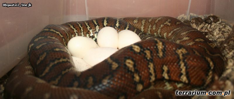 Jak wspomniałem powyżej, Morelia bredli nie jest trudnym do rozmnożenia wężem o ile mamy stabilne warunki w hodowli (brak dużych fluktuacji dobowych temperatury czy wilgotności, spokój i możliwość regulacji oświetlenia). Odpowiedniej wielkości i wieku węże; samice nie mniej niż 2000 g i 3 lata, samce 1000 g i 2 lata, wprowadzamy w sezon zimowy w połowie października. Wcześniej pozwalamy wężom na ostatnie wypróżnienie po posiłku, odczekujemy 14 dni i zaczynamy obniżać temperaturę w terrarium. Spadek temperatury rozkładamy w czasie tak, żeby wartość graniczną 25°C w dzień i 20°C w nocy osiągnąć z początkiem grudnia. Wówczas utrzymujemy węże w tych warunkach do końca stycznia, względnie połowy lutego. Morelia bredli jest typowym „Spring breeder”, co oznacza, że do kopulacji i ciąży dochodzi po zakończeniu okresu zimowego. Zanim połączymy samca z samicą (UWAGA: samca zawsze wpuszczamy do terrarium samicy, nigdy odwrotnie!), skokowo, na przestrzeni 5-10 dni przywracamy warunki „letnie” i dodatkowo możemy połączyć to z codziennymi wieczornymi opryskiwaniami terrarium wodą. Wówczas wprowadzamy samca do samicy. Kopulacja powinna mieć miejsce na przestrzeni paru godzin, bądź 1-2 dni. Jeśli do tego nie dojdzie to rozdzielamy zwierzęta i ponownie po upływie 7 dni wprowadzamy samca. Tak postępujemy (o ile nie zauważymy kopulacji) do końca marca. Jeśli udało nam się zaobserwować kopulacje i są one intensywne to pozwalamy samcowi na odpoczynek 1-2 dniowy po 7 dniach kopulacji. Całość procesu trwa około 1-2 miesięcy, aczkolwiek nie jest to reguła i znane są odstępstwa od jednorazowego sukcesu aż do półrocznych „manewrów”. W momencie, w którym samiec przestanie się interesować samicą na przestrzeni 2-3 tygodni powinniśmy zaobserwować zgrubienie owulacyjne trwające około 24 godziny. Od tego momentu liczymy około 50-60 dni na trwającą ciążę i po tym czasie powinniśmy zaobserwować złożenie przez samicę jaj. W połowie trwania ciąży należy wprowadzić gniazdo. Najlepiej do tego można wykorzystać drewniane bądź styropianowe pudło z otworem odpowiednim dla średnicy ciała samicy wyłożone wilgotnym torfem lub mchem. Najprawdopodobniej będzie to miejsce, w którym samica zniesie jaja. Morelia bredli jest, jak już wspomniałem wężem znanym z dość dużych miotów, nierzadko zaobserwować można stos jaj w liczbie 30 sztuk. Są dwie metody inkubacji jaj; sztuczna i naturalna. W przypadku pierwszej, której jestem zdecydowanym zwolennikiem, jaja należy przełożyć do inkubatora typu półsuchego i w temperaturze 31,5°C inkubować je do rozwiązania, które następuje po około 55 dniach. Tak dokładna wartość temperatury ma znaczenie, ponieważ daje szansę „gorszej jakości” zarodkom na rozwój. Odstępstwa +/- 1°C mogą prowadzić do utraty części jaj. Ważnym czynnikiem jest wilgotność; po mniej więcej tygodniu od rozpoczęcia inkubacji środowisko w poprzek skórki jaj się stabilizuje i wiemy czy wilgotność jest zbyt niska czy odpowiednia- widać to po stopniu naprężenia skórki. Jeśli jajo wydaje się miękkie bądź „luźne” to wilgotność należy podnieść, jeśli jajo się „poci” to należy zapewnić dodatkową wentylację. Należy pamiętać, że pod koniec inkubacji jaja zaczną się zapadać naturalnie, jest to związane z ubywaniem treści wewnątrz na tworzenie zarodka oraz wyparowywanie, którego nie zrekompensuje wysoka wilgotność, jednak przez pierwsze 30-40 dni jaja powinny być dość twarde. Po mniej więcej 4-5 tygodniach inkubacji możemy jaja podświetlić mocną latarką żeby sprawdzić czy rozwój naczyń włosowatych i samego zarodka przebiega prawidłowo- powinniśmy widzieć sieć podskórnych naczyń krwionośnych, wnętrze powinno być czerwonawe w odcieniu i na dnie powinno być widać ciemny „twór”- zarodek. Pod sam koniec ciąży (6-7 tydzień) widać będzie ruszającego się wężyka wewnątrz. Drugim, mniej popularnym sposobem inkubacji jest inkubacja naturalna z użyciem samicy. Zapewniamy samicy wyższą, średnią temperaturę, na poziomie 29-30°C i pozostawiamy jaja pod jej opieką. Można wówczas zaobserwować u samicy drżenie inkubacyjne, kiedy zwinięta na stosie jaj samica będzie energicznie drżeć, co ma pobudzić jej mięśnie do wytwarzania dodatkowego ciepła. Ten sposób inkubacji jest moim zdaniem bardziej ryzykowny gdyż istnieje możliwość delikatnych wahań temperatury, które wyeliminują słabiej rozwijające się zarodki. Oczywiście wielu hodowców stosuje tą metodę ze 100% skutecznością, jednak kontrola warunków w dużym zbiorniku jest na pewno trudniejsza niż w małym zamkniętym inkubatorze. Młode wykluwają się przebijając skórkę, co trwa około 1-2 dni. Nie należy wyciągać węży z jaj, ponieważ często zdarza się, że młode przebywają 1-2 dni w jaju wystawiając jedynie głowę na zewnątrz. Po wyjściu z jaj całkowicie młode przekładamy do zbiornika wyłożonego wilgotnymi ręcznikami papierowymi gdzie mogą przebywać przez parę dni aż do oderwania lub całkowitej resorpcji żółtka. Po pierwszej wylince możemy podjąć próbę karmienia. Należy mieć w świadomości, że Morelie bredli jak i pozostałe spiloty nie są najprostszymi do rozkarmienia, ale najlepszym lekarstwem jest cierpliwość. Osobiście miałem osobniki niejedzące przez 8 miesięcy, więc należy uzbroić się w cierpliwość. Na metody typu smarowania płynem mózgowo rdzeniowym kurcząt czy karmienie przymusowe papką z osesków mysich jest zawsze czas, ale nie wcześniej niż po 6-7 miesiącach bardziej „normalnych” prób.